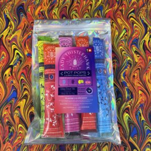 I’ve been loving the Lady Thistlehawk Pot Pops. If you loved Otter Pops as a kid you’ll love this THC spin! A pack of 8 pops you can toss in the freezer and grab whenever you want a little infused snack. Enjoy your holiday events with a little high and a sweet treat!